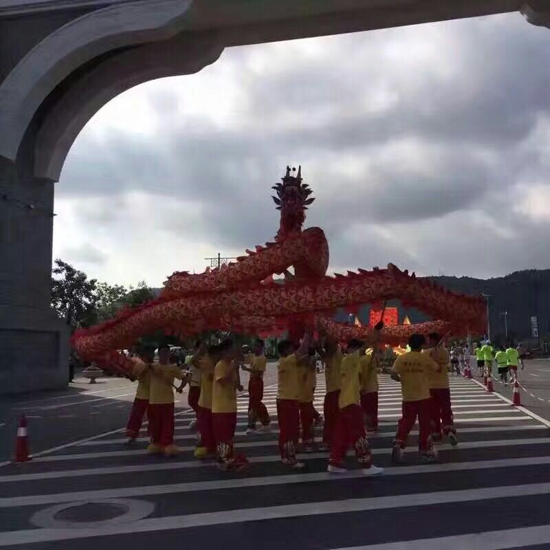 舞龍(dragon dance)的“龍”,通常都安頓在當(dāng)?shù)氐凝埻鯊R中,舞龍之日,以旌旗、鑼鼓、號角為前導(dǎo),將龍身從廟中請出來,接上龍頭龍尾,舉行點(diǎn)睛典禮。龍身用竹扎成圓龍狀,節(jié)節(jié)相連,外面覆罩畫有龍鱗的巨幅紅布,每隔5、6尺有一人掌竿,首尾相距約莫有十?dāng)?shù)來丈長。龍前由一人持竿領(lǐng)前,竿頂豎一巨球,作為引導(dǎo)。舞時(shí),巨球前后左右四周搖擺,龍首作搶球狀,引起龍身游走飛動。